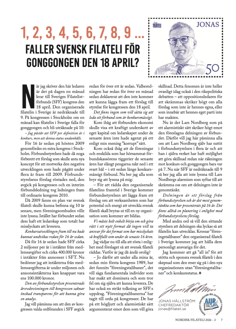 Den organiserade filatelin i Sverige är nedräknade till 9. På kongressen i Stockholm den 18 april kan filatelin i Sverige falla för gonggongen och bli uträknade på 10: – Jag påstår att SFF per definition är i konkurs, men att denna status undanhålls. Den av förbundsstyrelsen presenterade årsredovisningen till kongressen saknar önskad transparens för att kunna göra en analys.